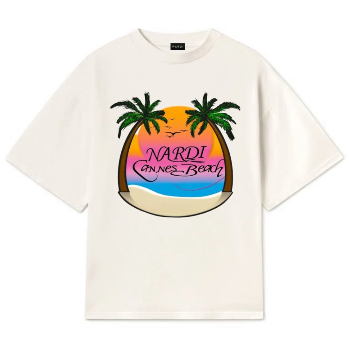 Description: This premium white t-shirt from NARDI features a vibrant graphic inspired by the idyllic "Cannes Beach" setting. The design showcases silhouetted palm trees against a colorful sunset backdrop, evoking a relaxed, vacation-ready feel. Crafted for comfort and style, this tee is perfect for casual wear, capturing the essence of summer and beachside vibes.